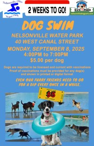 Nelsonville Water Park is sponsoring a Dog Swim to benefit the Nelsonville Dog Park. Monday, September 8, 2025, from 4:00PM until 7:00PM. $5.00 per dog to enter; larger donations are welcome: all proceeds to aid in establishing a Nelsonville Dog Park. Bring your dogs to romp and play and swim. Dogs, Fun and water – you can’t have a better time than that!