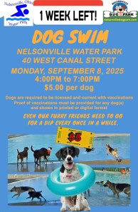 Nelsonville Water Park is sponsoring a Dog Swim to benefit the Nelsonville Dog Park. Monday, September 8, 2025, from 4:00PM until 7:00PM. $5.00 per dog to enter; larger donations are welcome: all proceeds to aid in establishing a Nelsonville Dog Park. Bring your dogs to romp and play and swim. Dogs, Fun and water – you can’t have a better time than that!